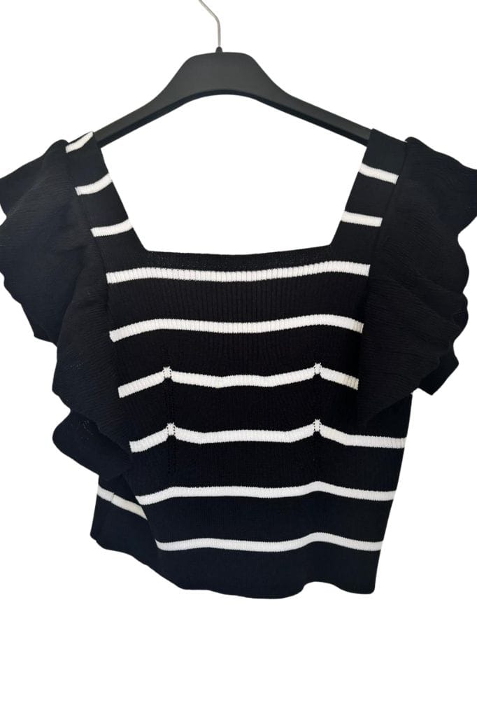 Top negro corto de rayas blancas. Detalle de volantes en los hombros. Un básico.