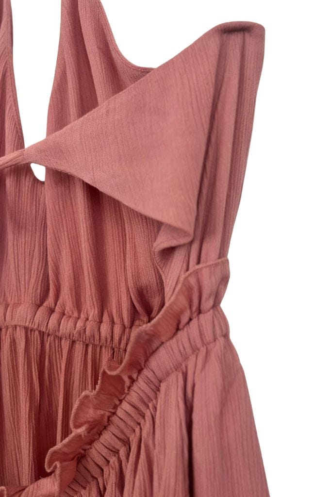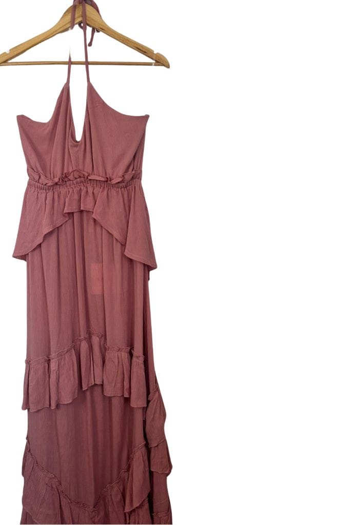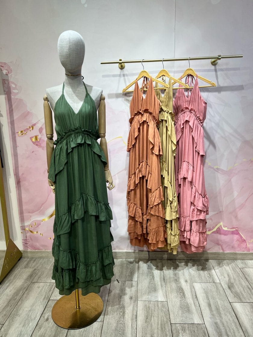Vestido largo de estilo boho, fluido con volantes en el bajo y escote.